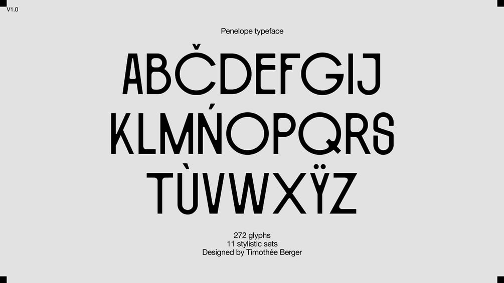 Penelope is a sans-serif typeface that takes its art deco heritage and modernises it with bold curves and angles. Its letters give it a perfect rhythm for headlines or important text elements.
